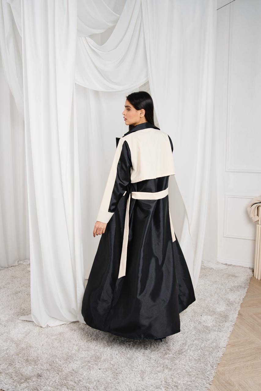 A statement in black and beige. This elegant abaya blends a bold monochrome palette with a structured, coat-inspired silhouette. Designed with soft beige contrast panels and a refined belt detail at the back, it creates a graceful flow while maintaining a modern, polished look. Perfect for both day elegance and evening sophistication.